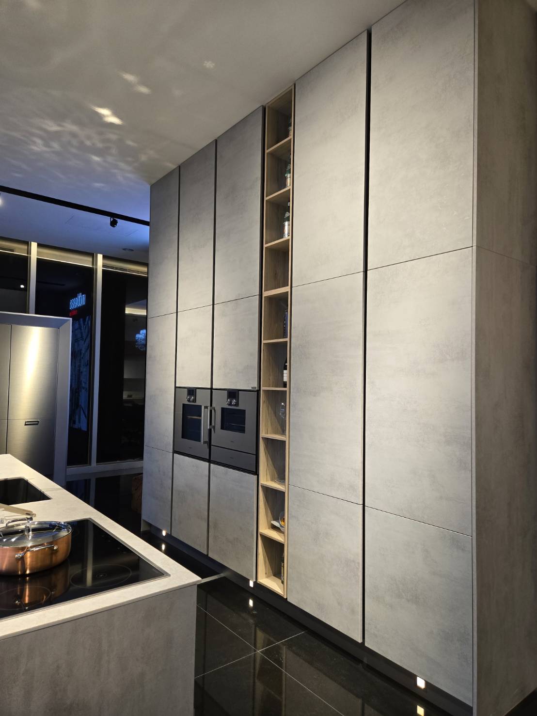 本次推出的現代感廚房設計,以清水模深咖啡色系的門板為主,完美展現低調而高雅的工業風格。廚房整體規劃注重動線設計,兼具實用性與美感,讓烹飪變得更加輕鬆愉快。中央的中島設計,不僅實用且富有品味,適合日常使用或親友聚會。無論是新成屋裝潢還是廚房翻新,這款設計都能輕鬆提升空間的現代時尚感,讓您的家更具格調與質感。