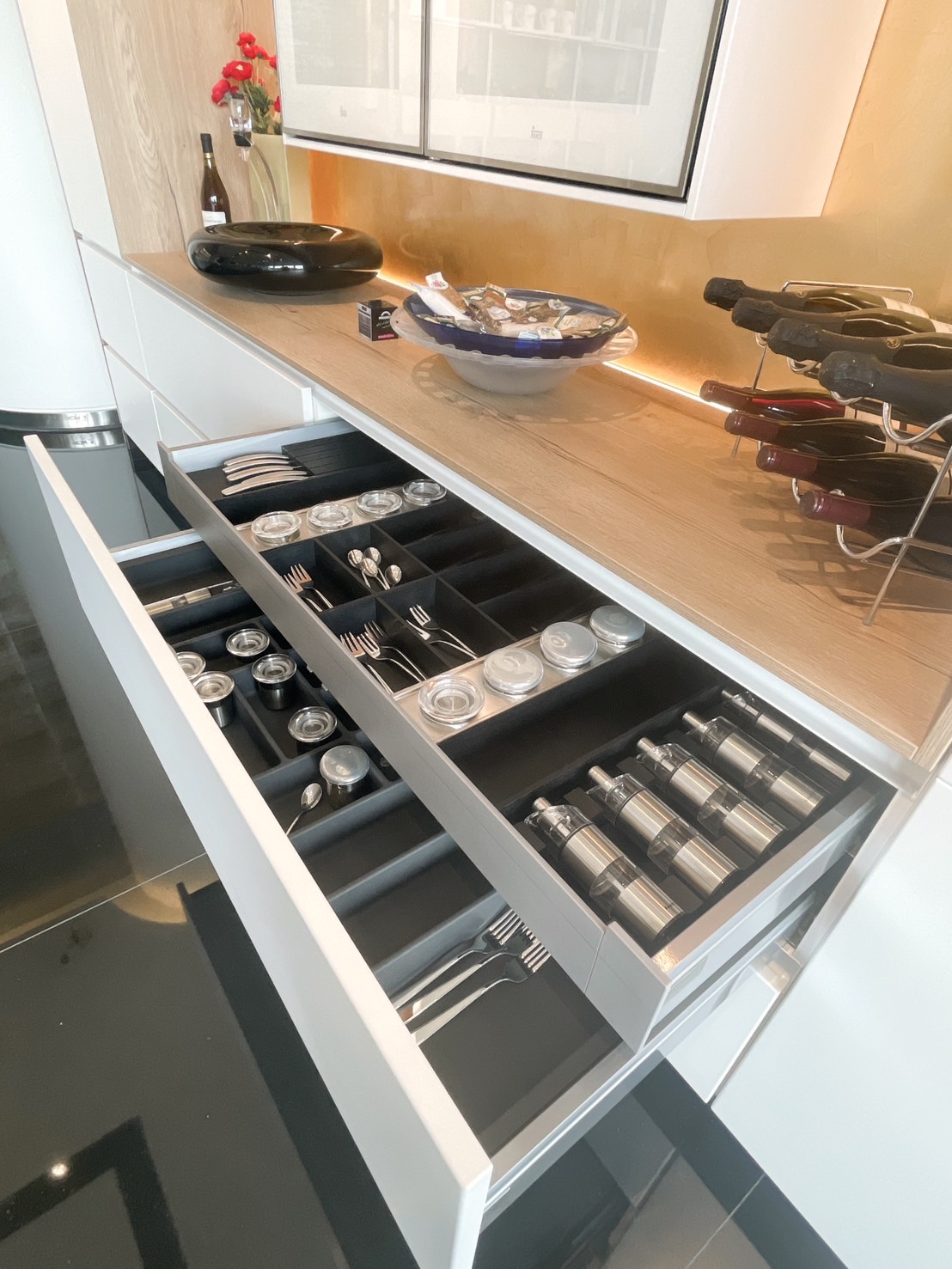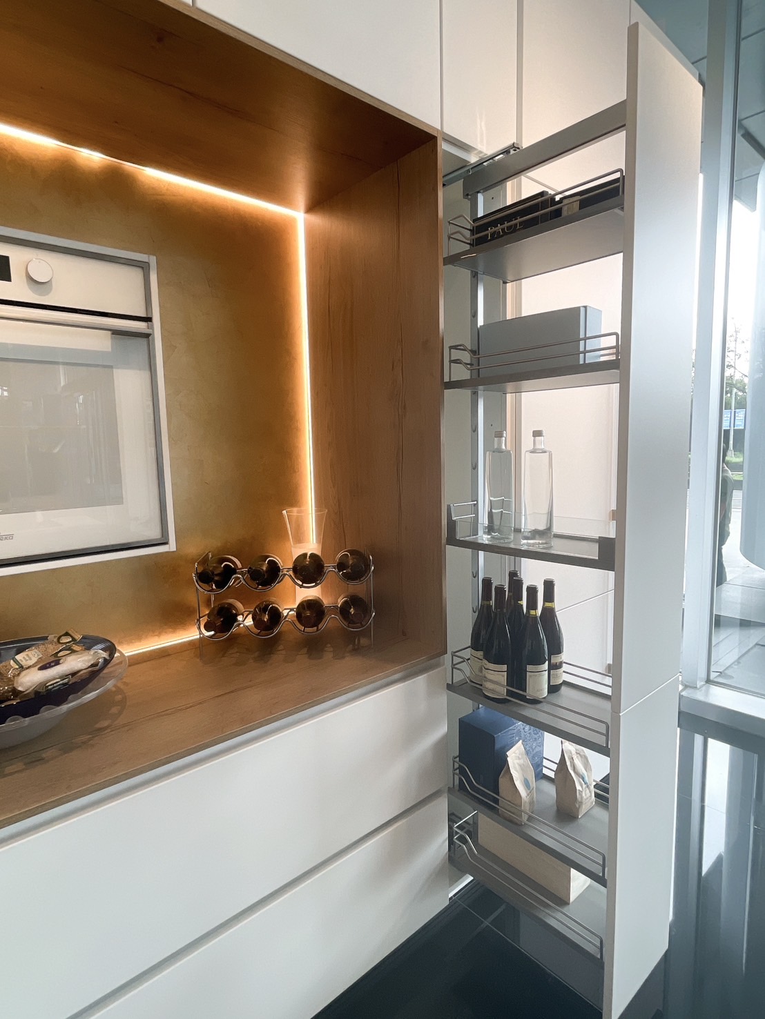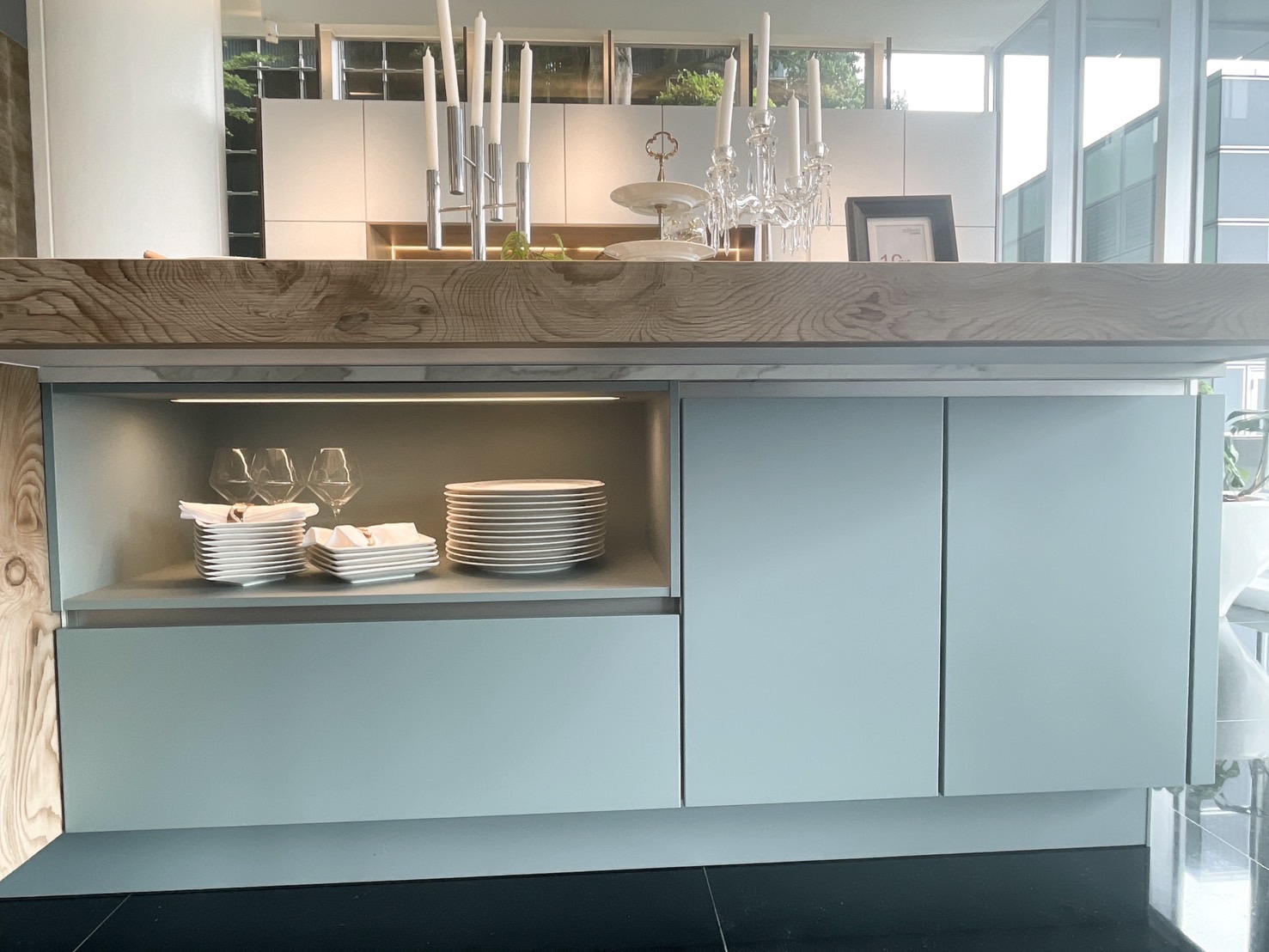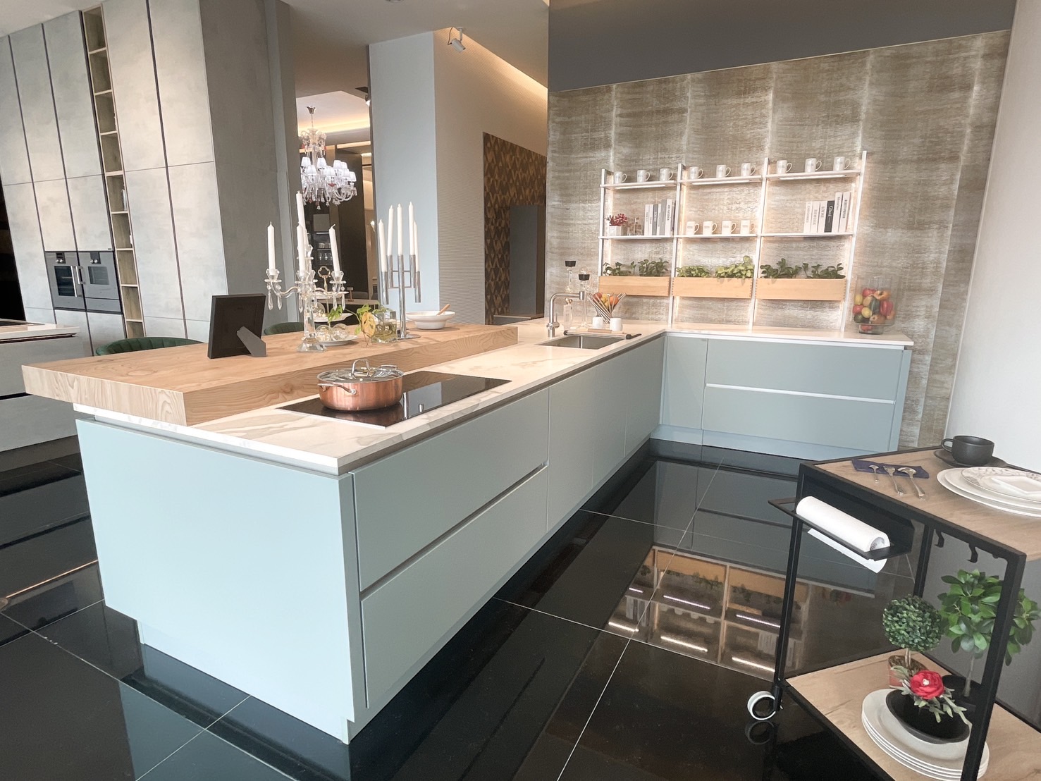 峽灣藍+金色無把手熱銷款,藍色是一種平靜的顏色,在廚房中使用藍色櫥櫃有助於營造寧靜的氛圍,完善的收納讓空間更顯寬敞。